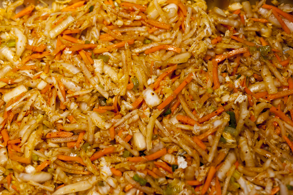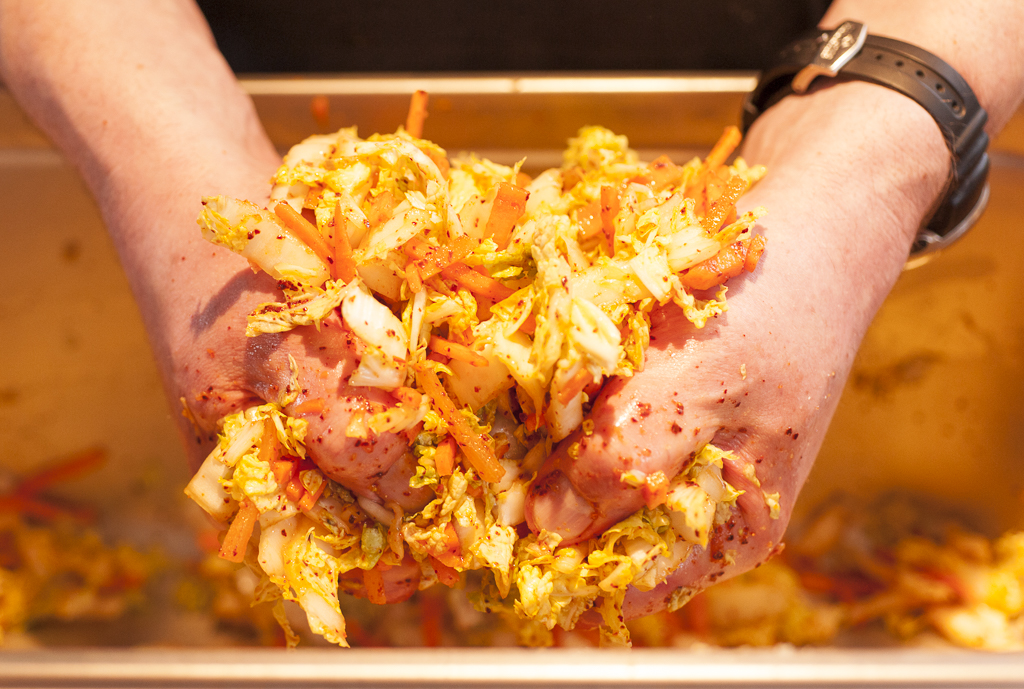 Meng alle ingrediënten in een ruime bak en wrijf en stamp met je blote mannen-klauwen alles door elkaar zodat de kool vocht los laat.