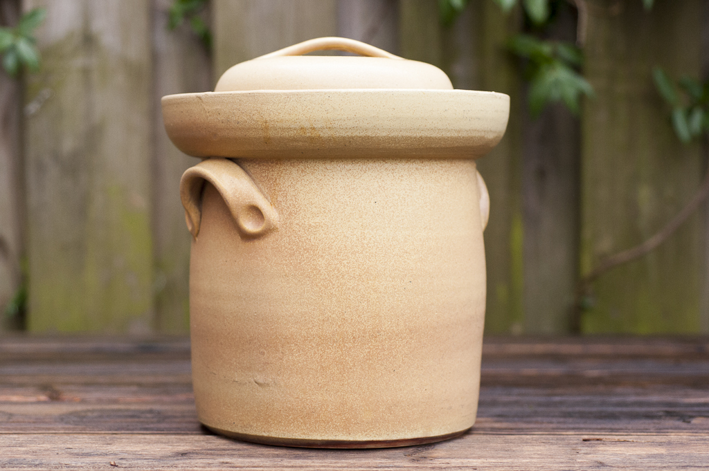Stop alles samen in een Keulse pot, dek af met de grove bladeren en leg er iets zwaars op, ik gebruik twee halve stenen.